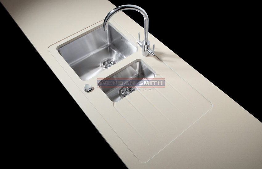 Minerva's 1.5 bowl duo sink module…650mm deep with recessed drainer area. Pre drilled for tap and pop-up waste. Will fit into 600mm base cabinet. Includes brushed stainless steel main bowl and separate small bowl, basket strainer, pop-up waste, fitting clips and sealant.