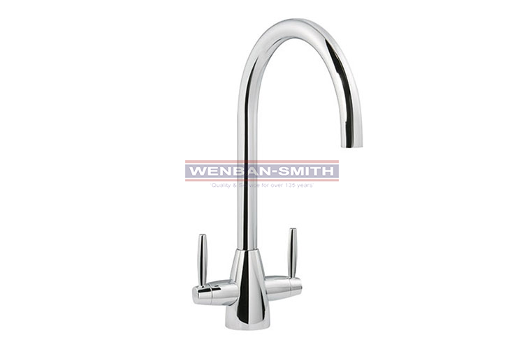The elongated, smooth curves of this twin lever mixer make it a bold and fashionable choice. Fitted with flow aerator.